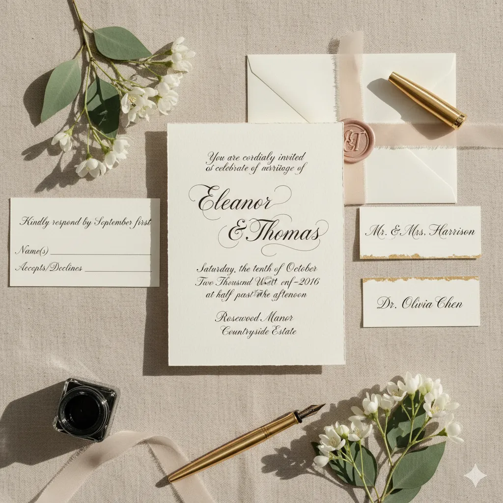Complete calligraphy service package including elegant script work for wedding invitations, place cards, and seating charts. Perfect for couples seeking sophisticated lettering that adds elegance to their special day.